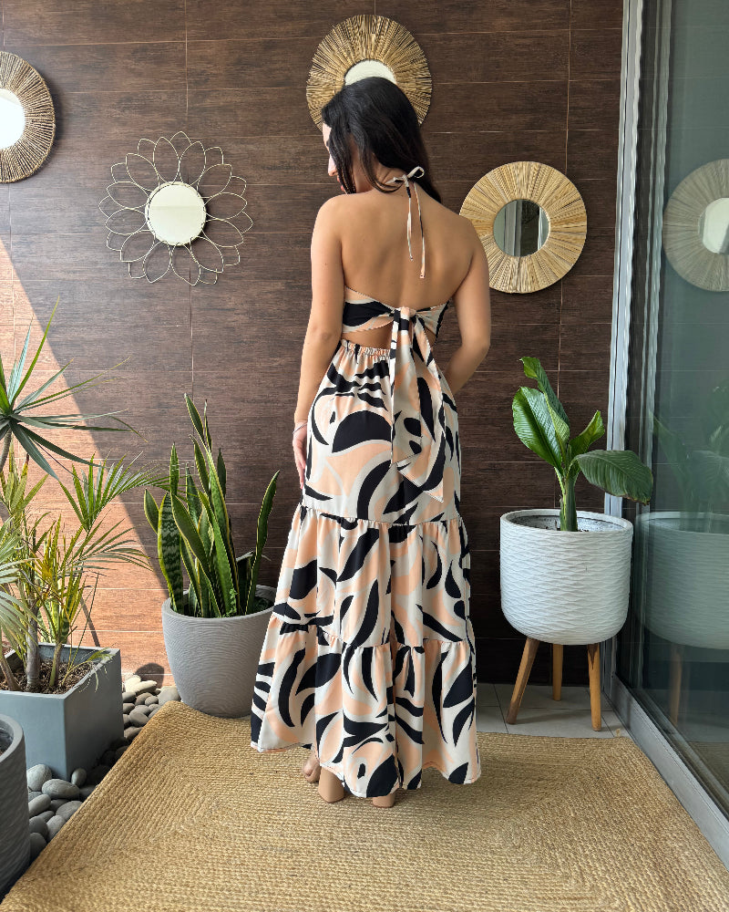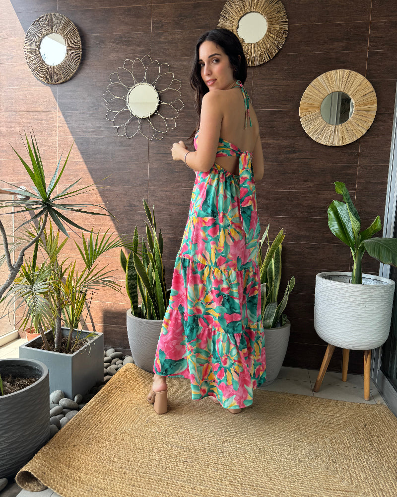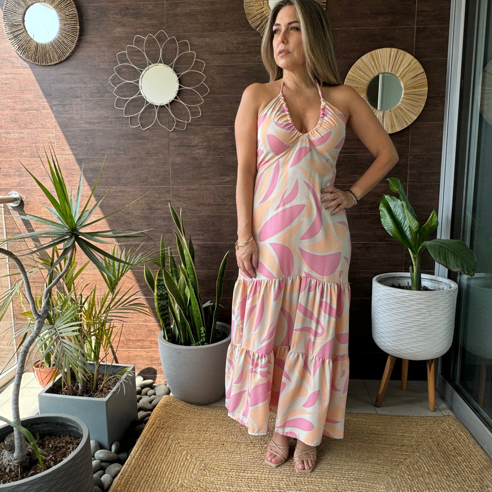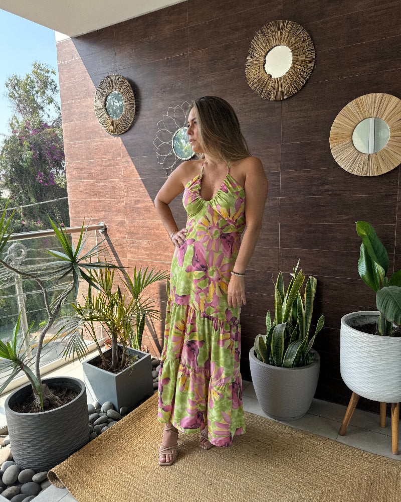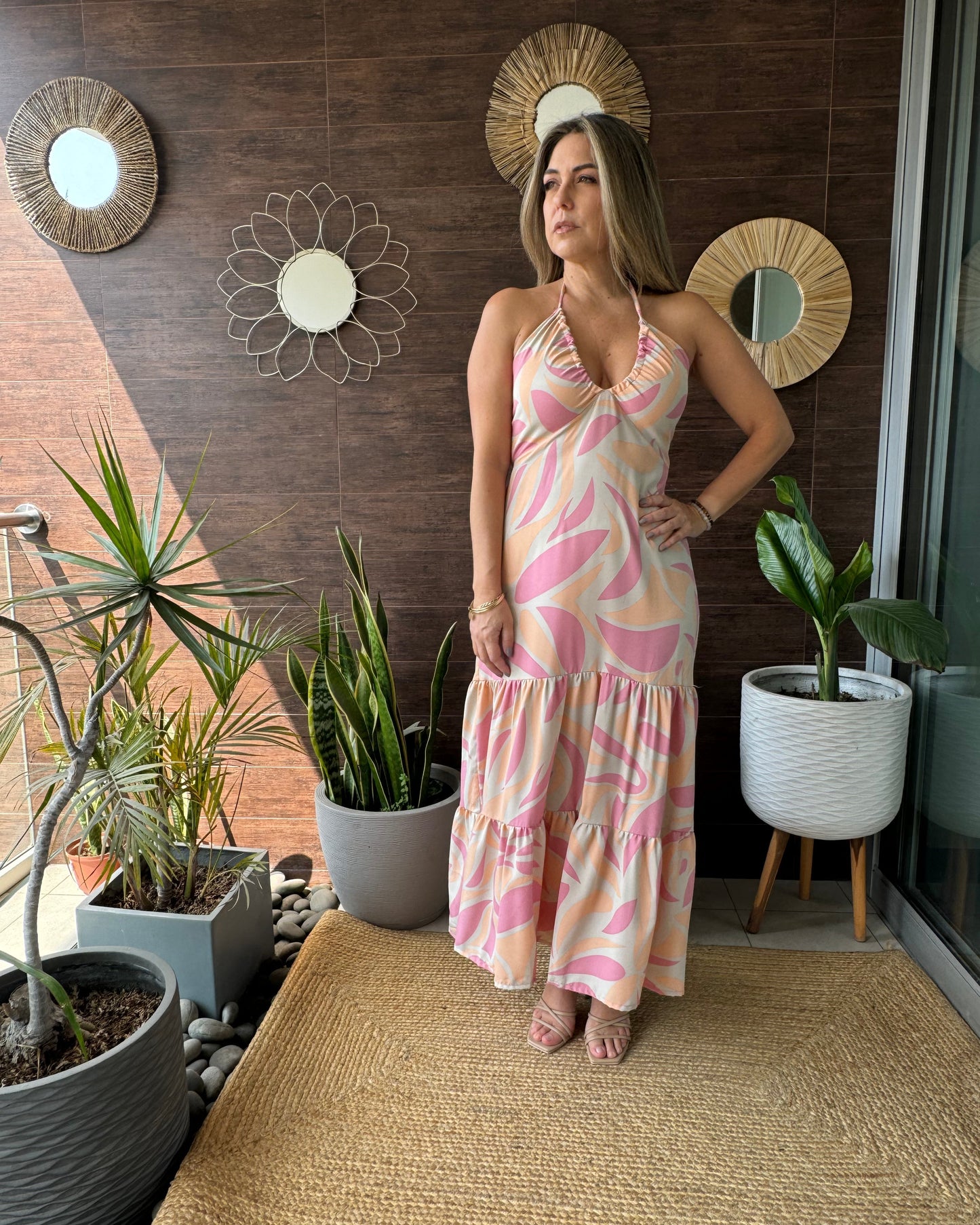 Vestido con amarre en el cuello y en la espalda. Tela seda francesa.