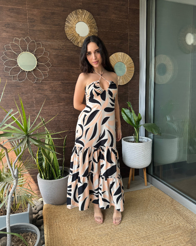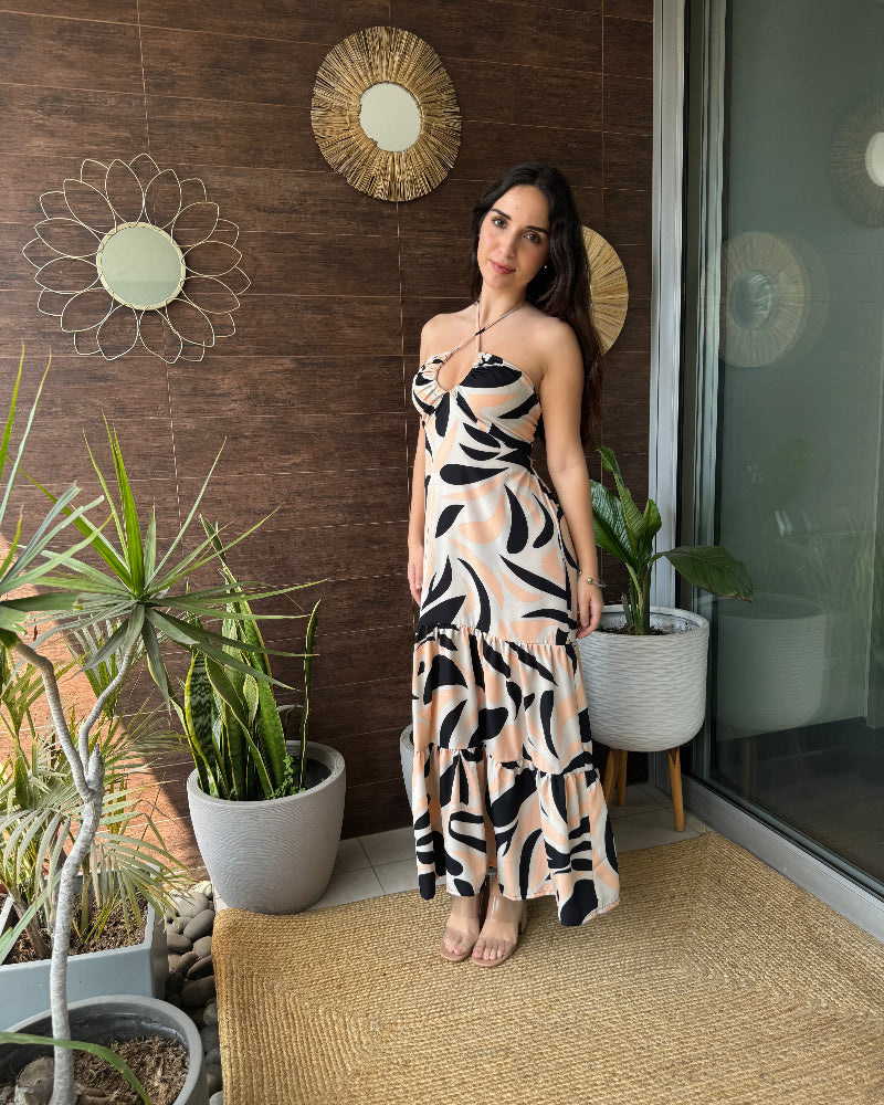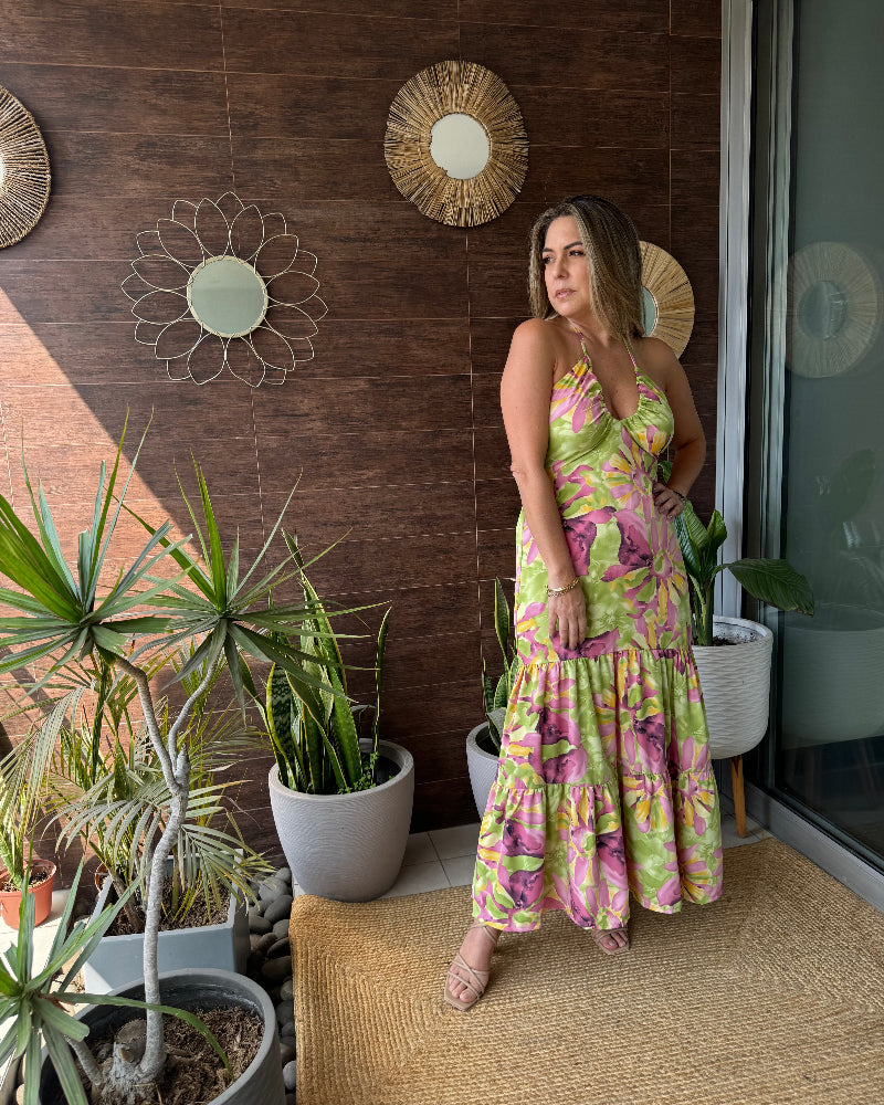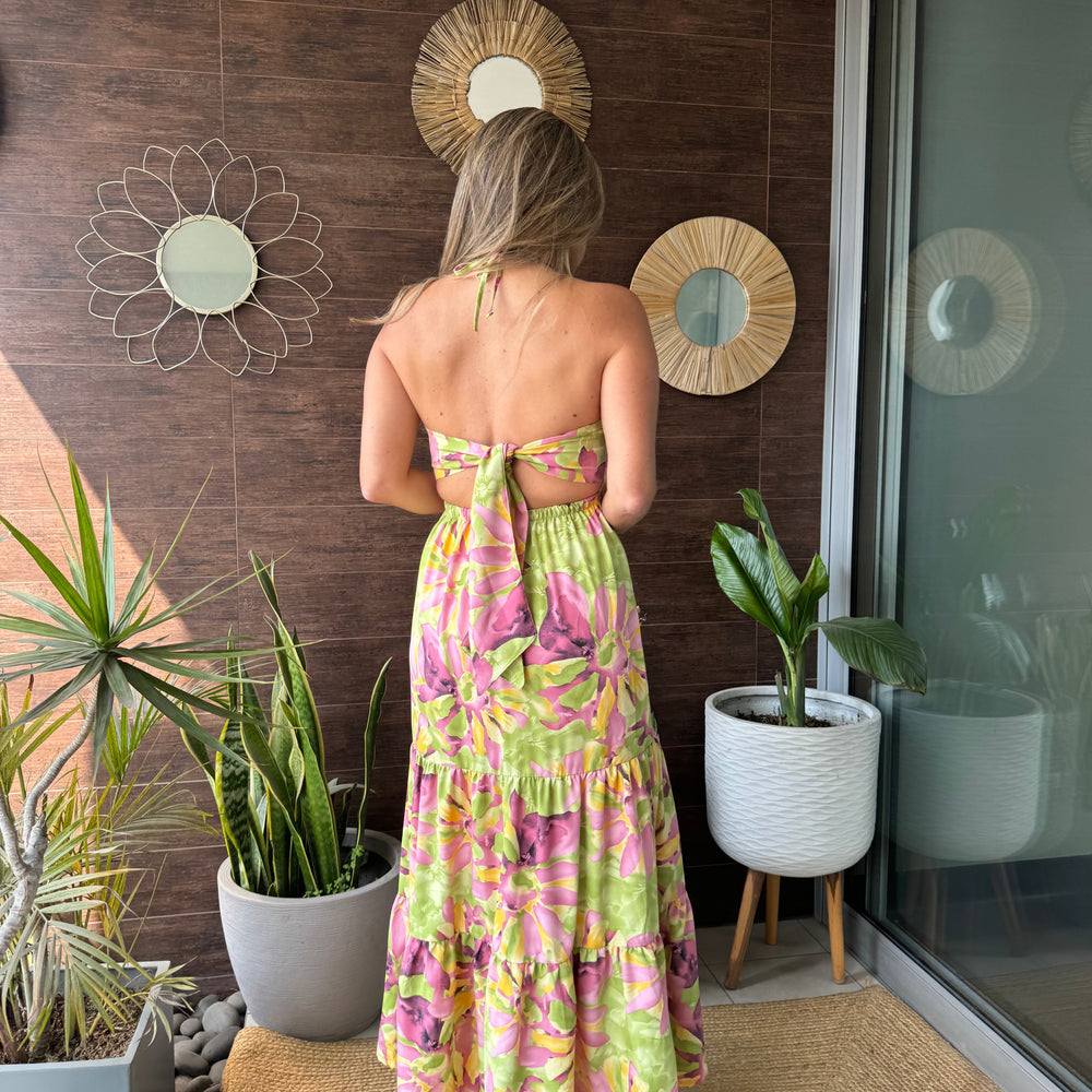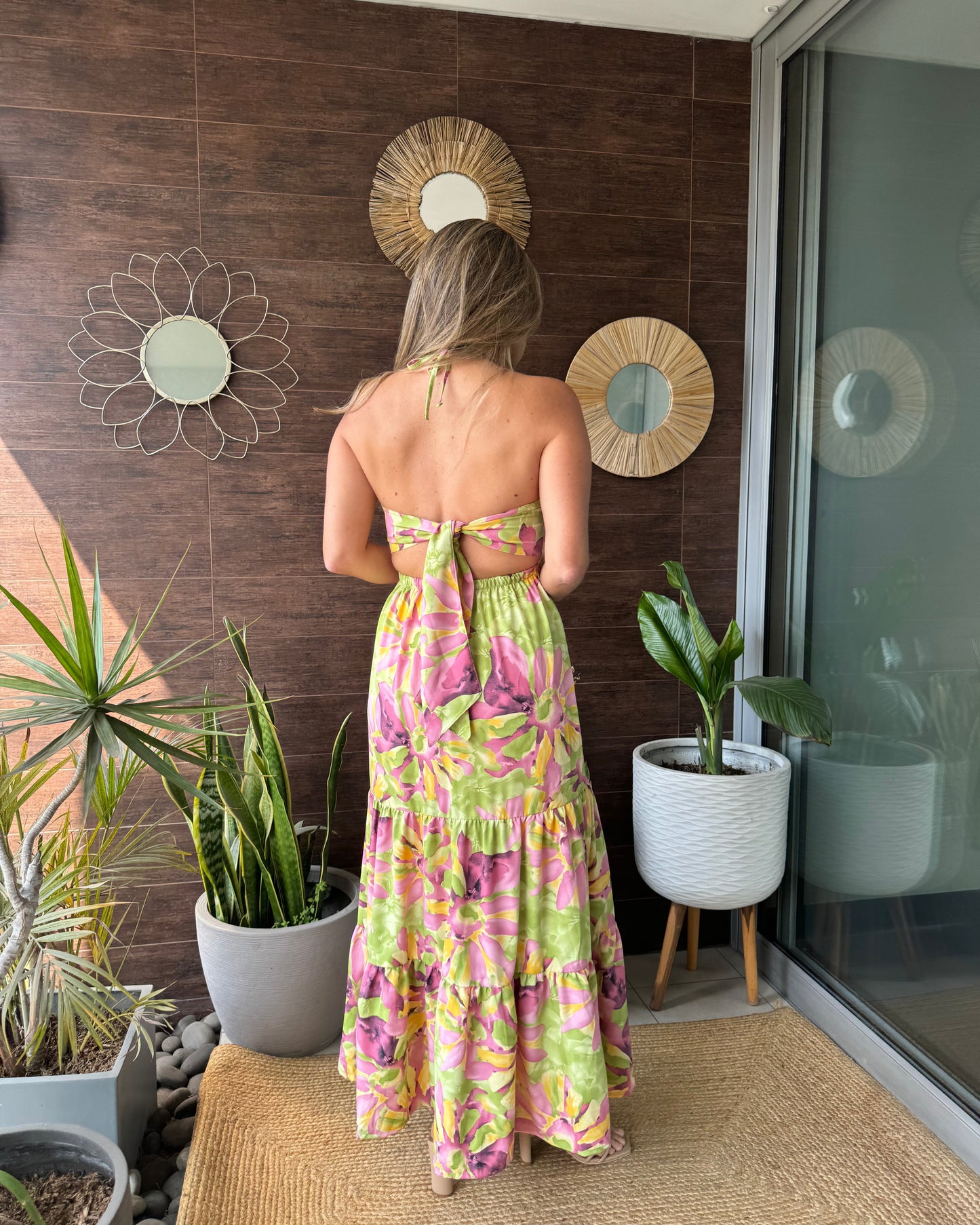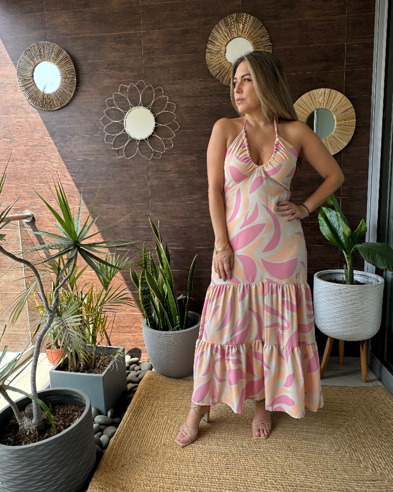 Vestido con amarre en el cuello y en la espalda. Tela seda francesa.