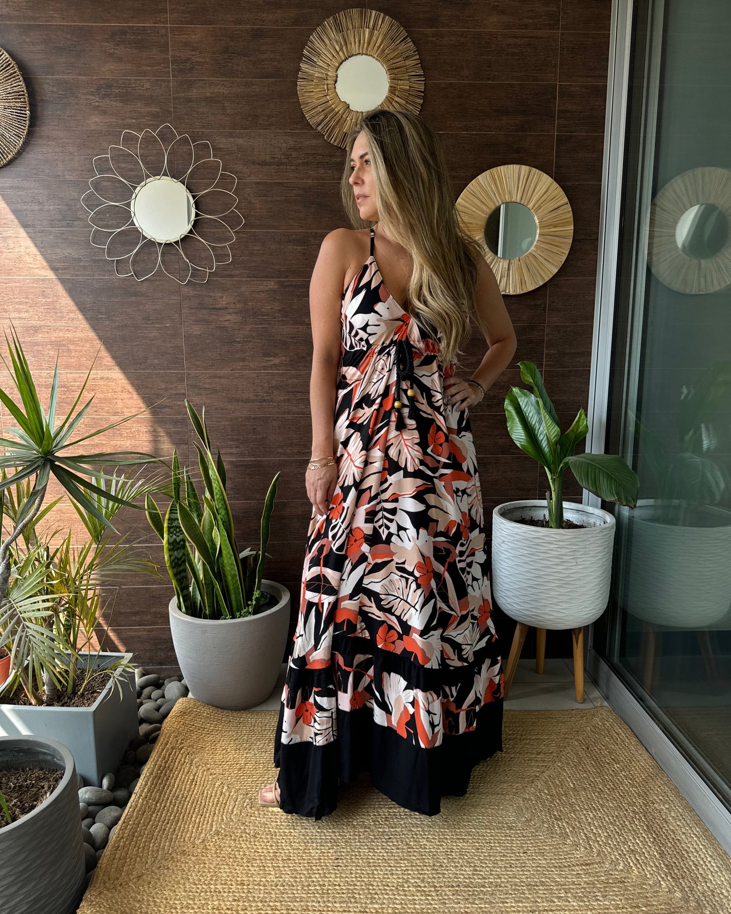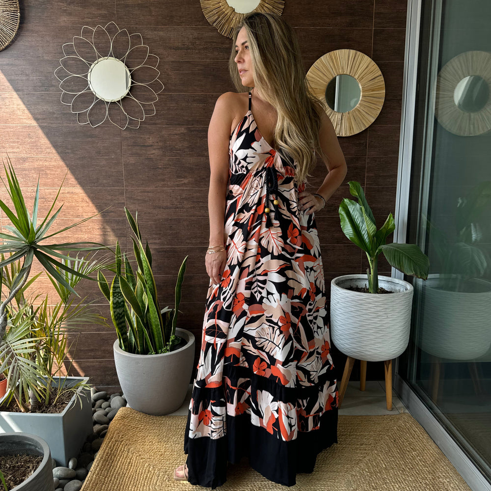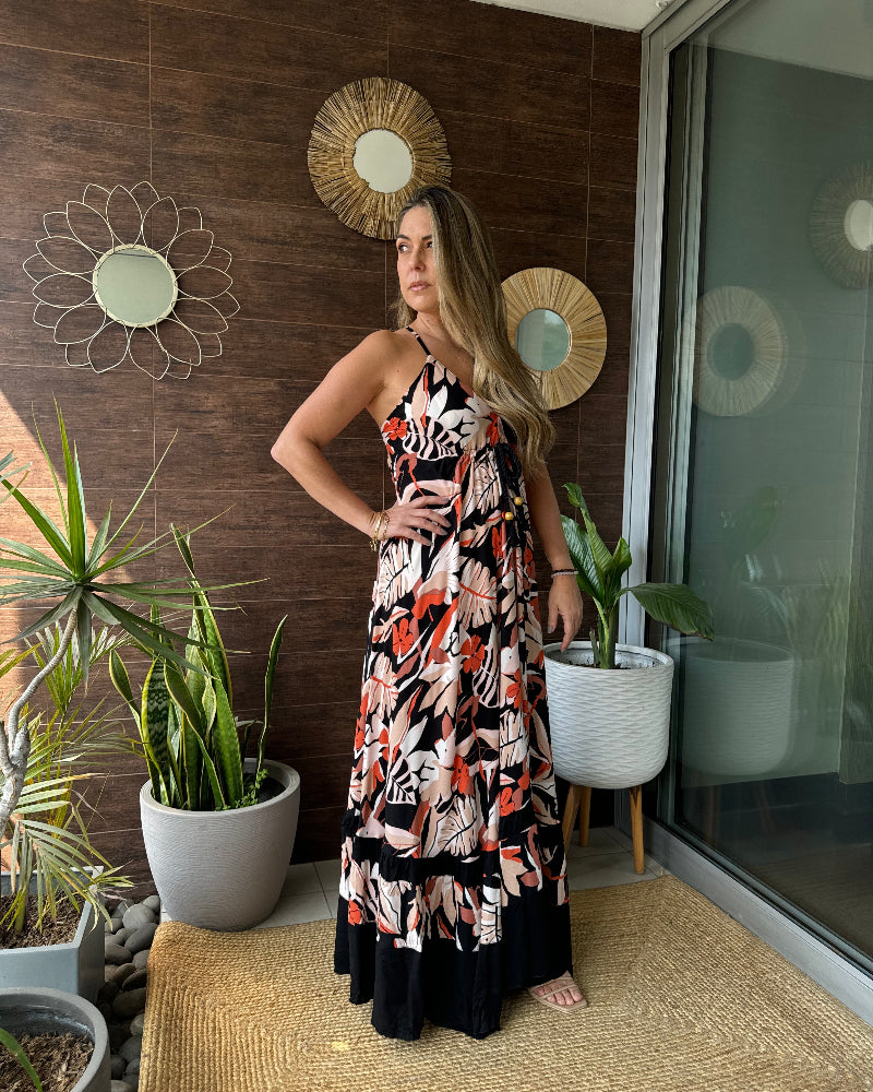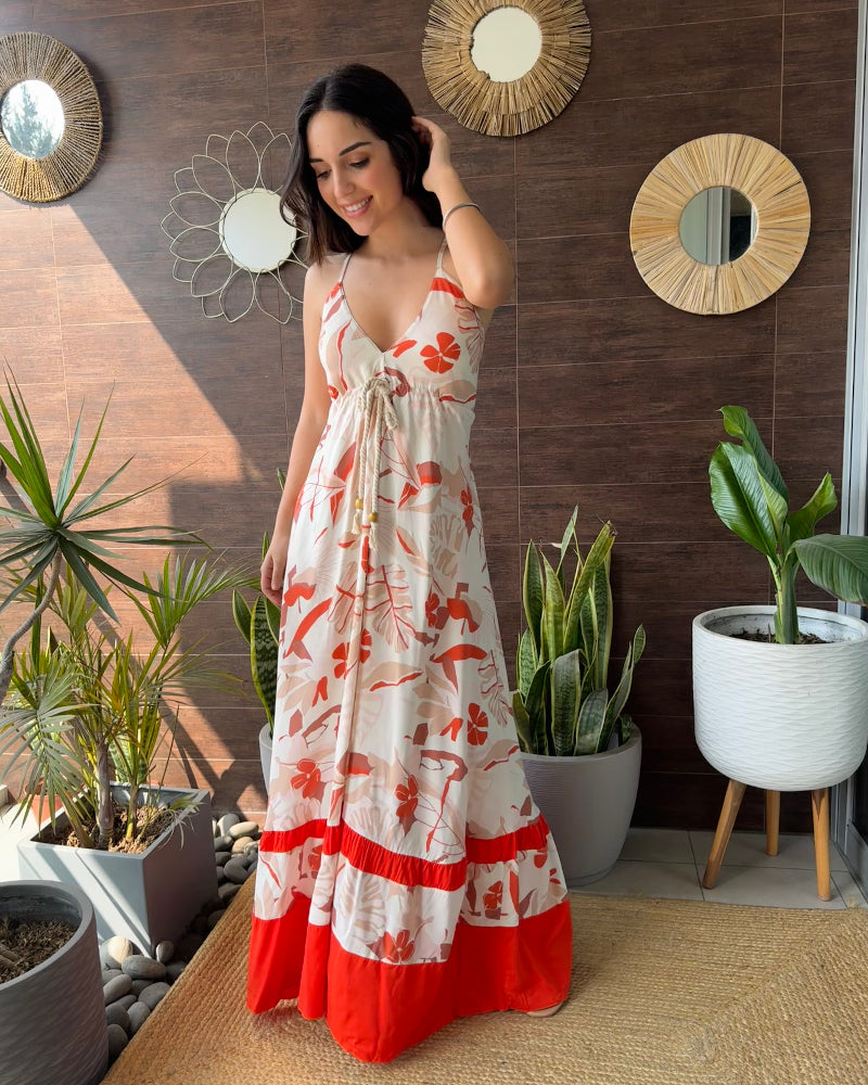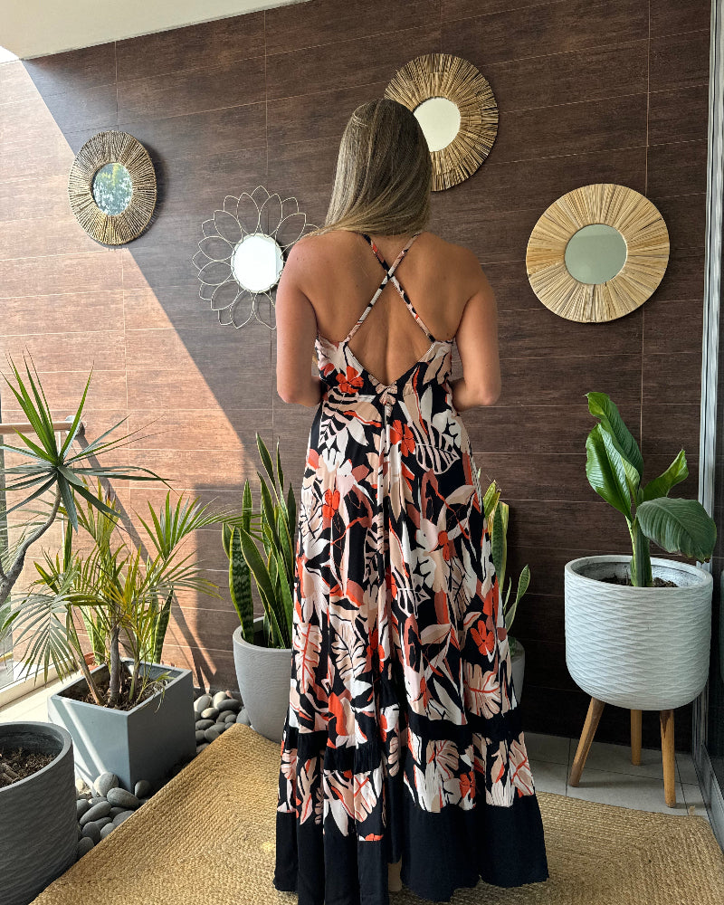 Vestido de Chalis con combinación de dos telas. Tiras regulables, amarre debajo del busto