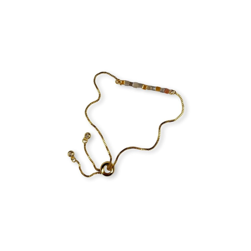 Pulsera de cobre bañado en plata, muranos, mostacillas checas, perlas japonesas, circones y postes hipoalergénicos. Con medida 27 cm