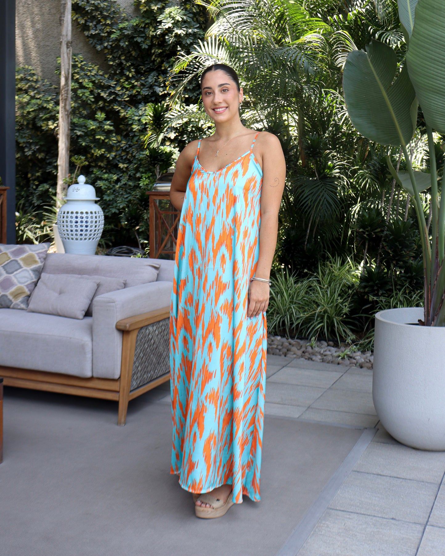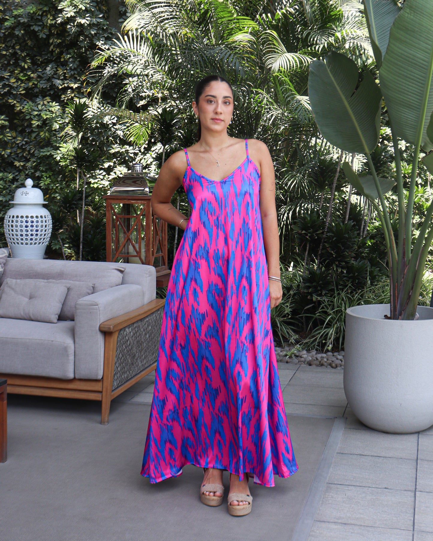 Vestido largo confeccionado en satén fluido con vibrante estampados. Su silueta ligera y caída natural lo convierten en una pieza elegante y versátil para climas cálidos. Presenta un escote en V suave y tirantes delgados regulables que aportan delicadeza y comodidad. El corte recto con ligero vuelo en el ruedo permite movimiento y favorece distintos tipos de cuerpo. Ideal para viajes, cenas de verano o eventos casual-elegantes.
