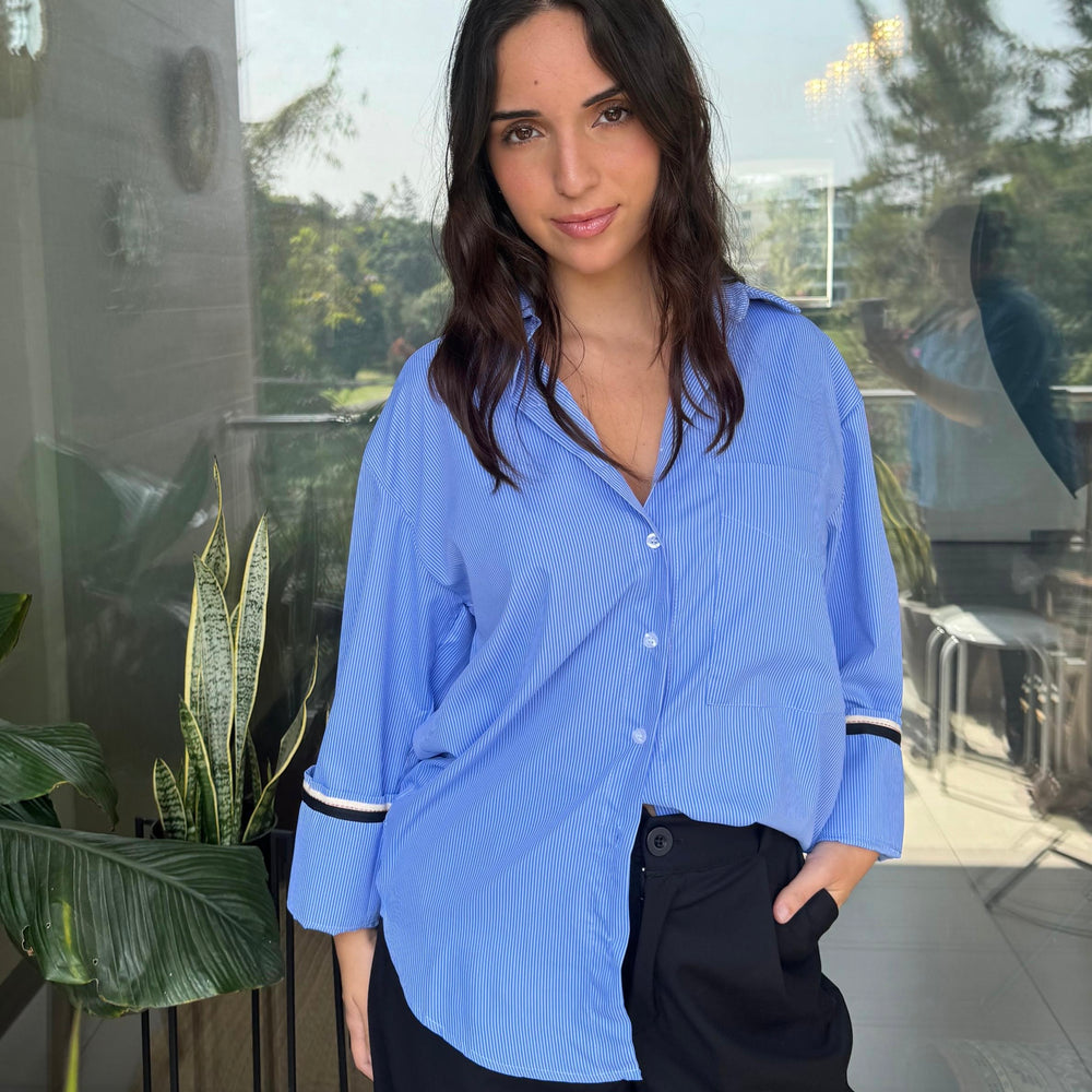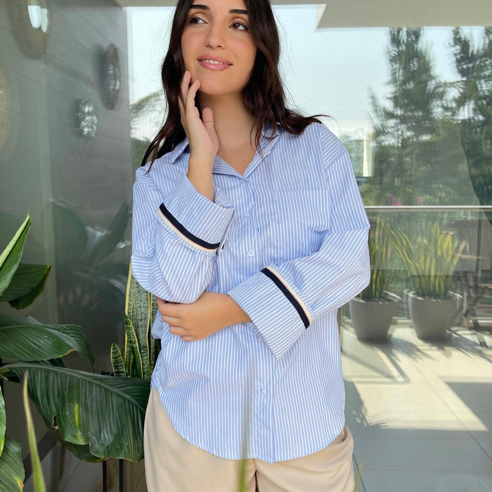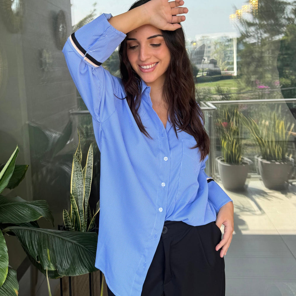 Presenta cuello clásico, botones al frente y mangas largas con detalle en contraste en los puños que aporta un toque moderno.