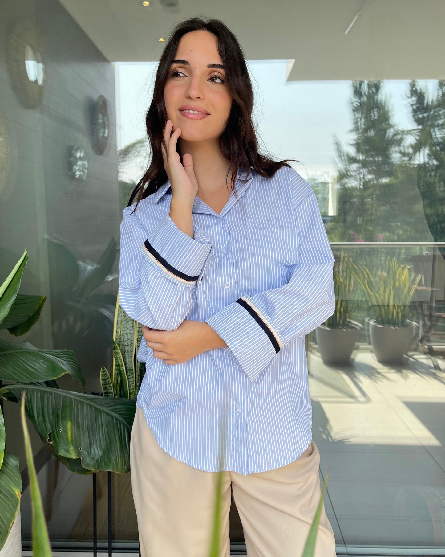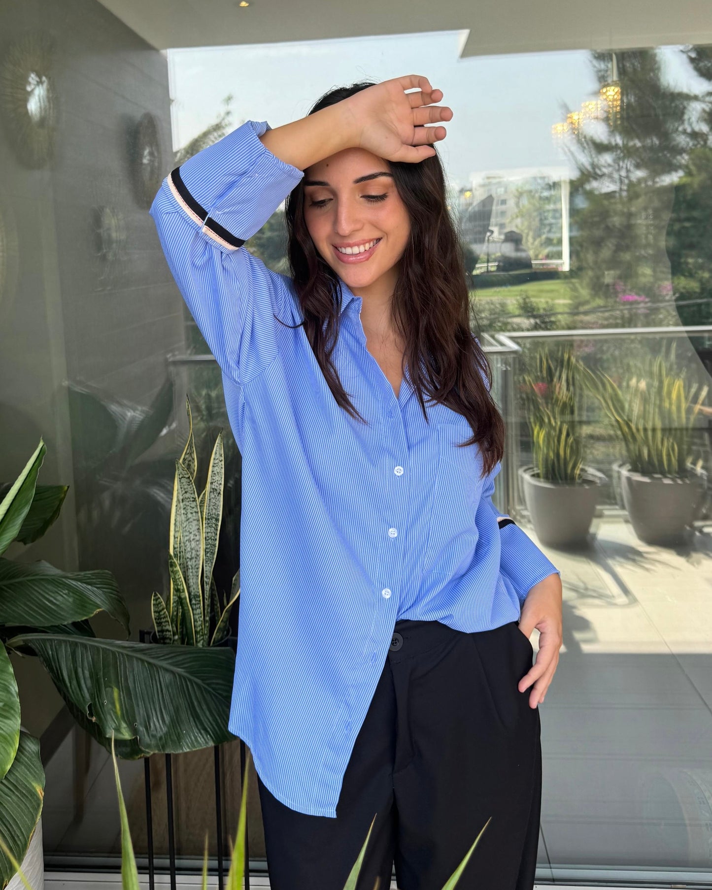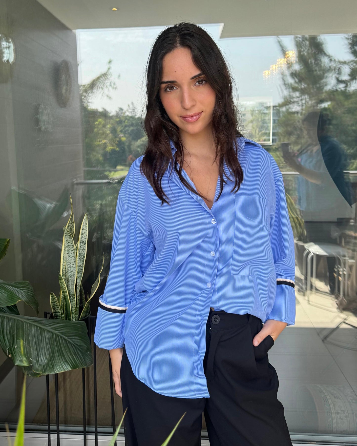 Presenta cuello clásico, botones al frente y mangas largas con detalle en contraste en los puños que aporta un toque moderno.