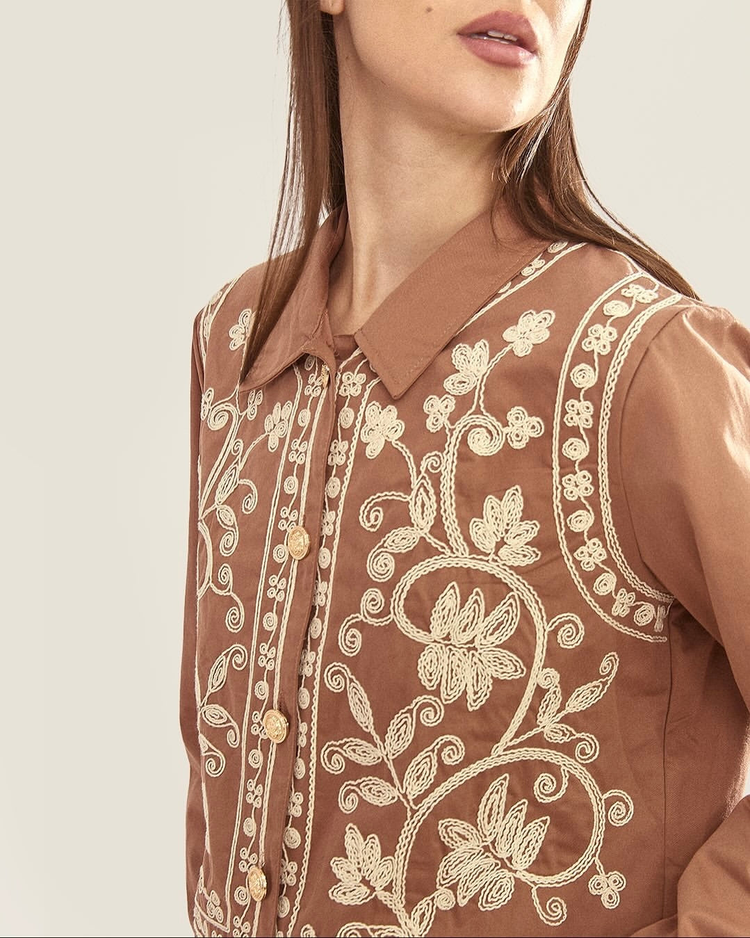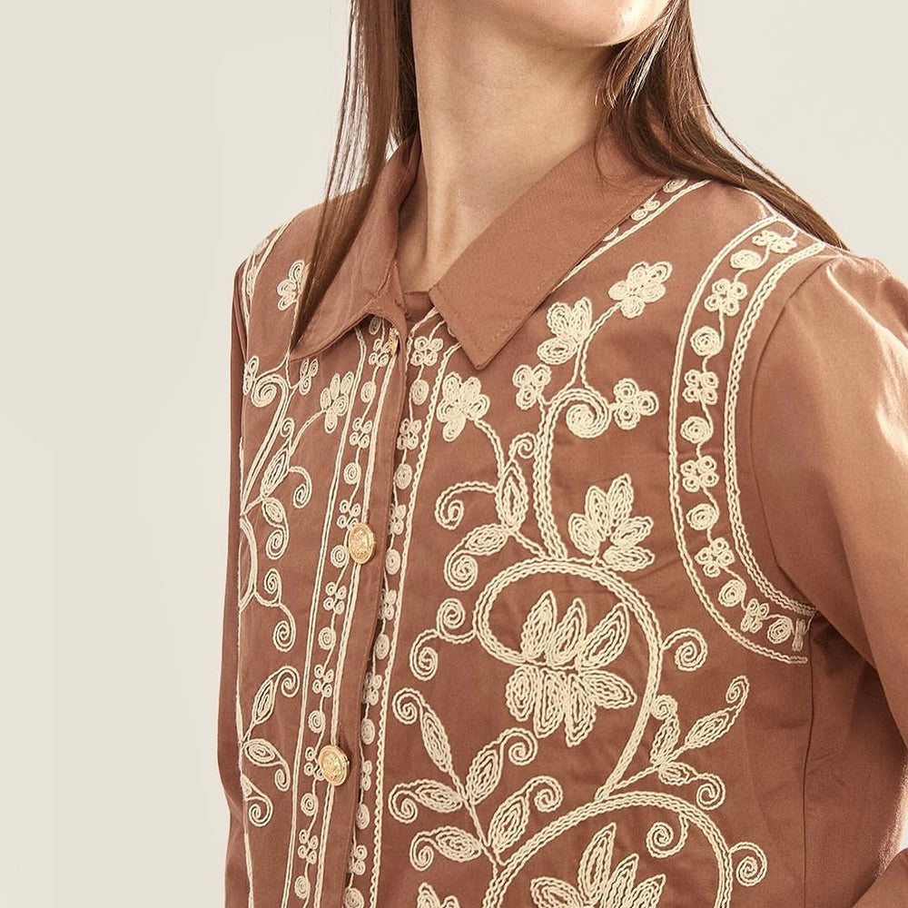 Camisa de manga larga en tono tierra con bordados florales. Un diseño artesanal y elegante para realzar cualquier look.