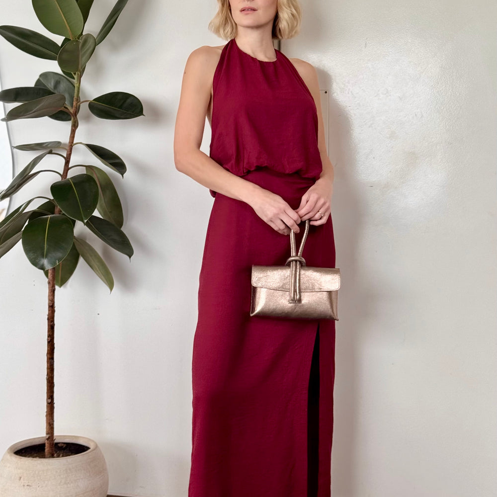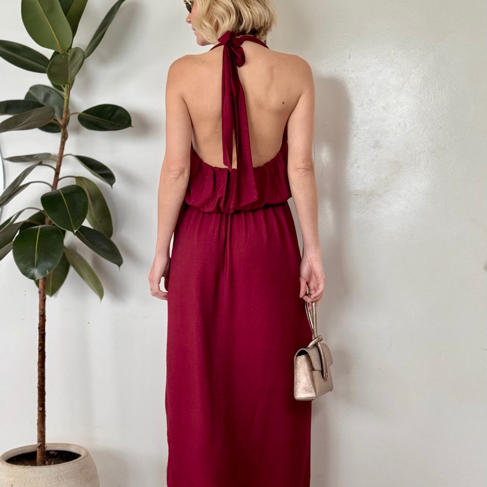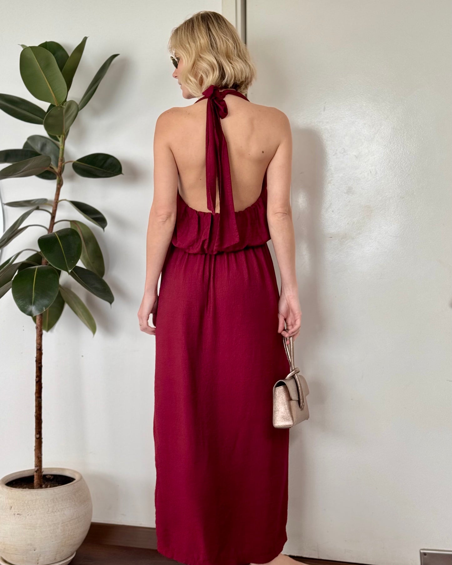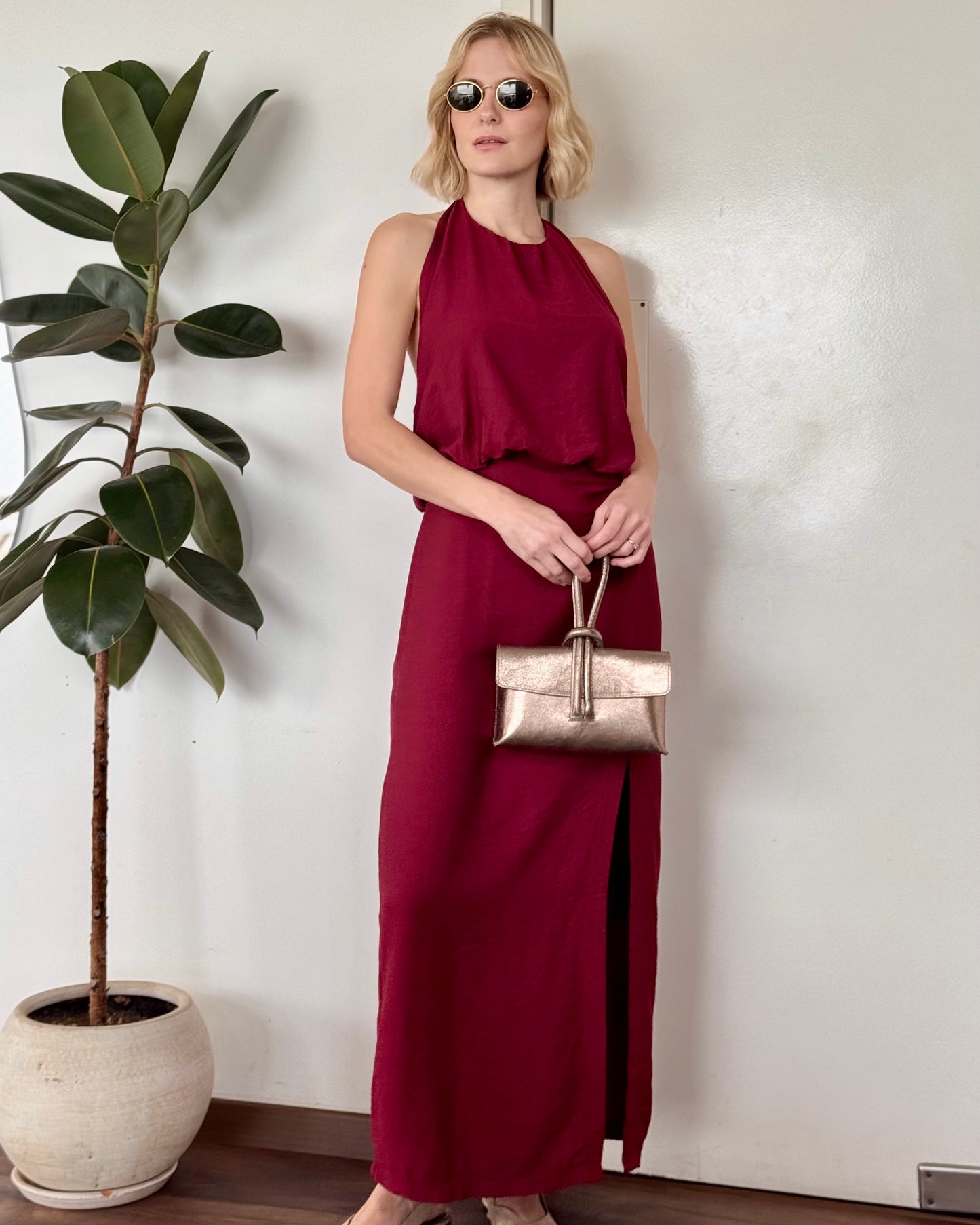 Vestido Coro con escote halter anudado al cuello, caída suelta en la parte superior y falda recta con abertura lateral que aporta movimiento y sensualidad.